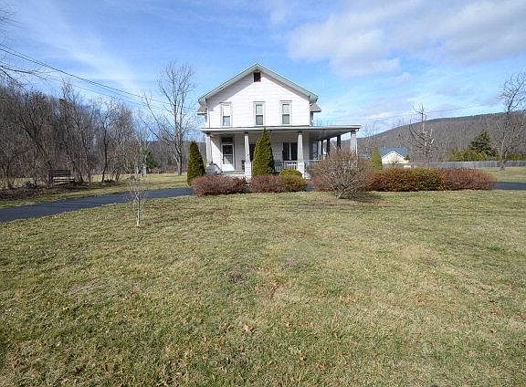 Stately farmhouse with a wrap-around porch, situated on two lots totaling over two and three quarter level acres with horseshoe drive, two car garage with overhead Family Room that has a wood burning fireplace. Spacious rooms throughout with hardwood floors, large Kitchen, Dining Room, Living Room, and Den that can be converted to a first floor bedroom, second floor has four large bedrooms with one and a half baths. Many windows appoint this home to bring in large amounts of natural light.