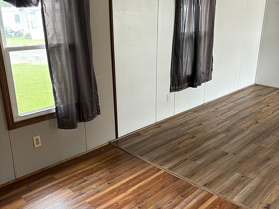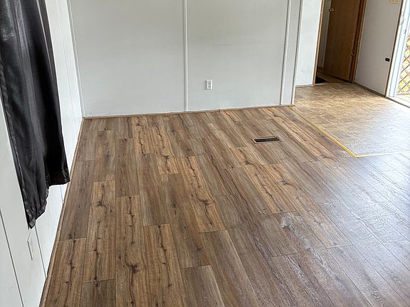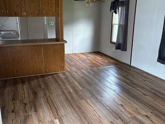 This is a mobile home with new flooring throughout. The layout has a kitchen bar and a washer/dryer hookup near the kitchen. One bedroom is extra-large. Trash and sewer are included in the rent. Renter pays for electric and water.