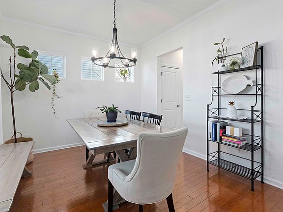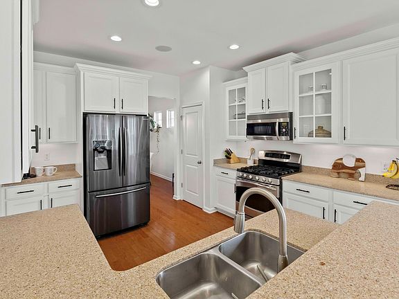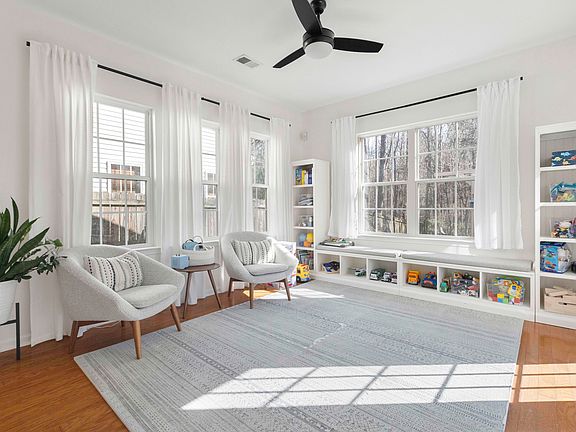 Welcome to this beautiful 3,300+ sqft home offering 5 bedrooms, 3 full bathrooms, and a versatile bonus room that can easily serve as a 6th bedroom. Designed for both comfort and style, this home features thoughtful upgrades, modern finishes, and a spacious, functional layout perfect for any lifestyle. The main level boasts a guest bedroom with a full bathroom, ideal for visitors or multi-generational living, along with a dedicated office off the entryway for a perfect work-from-home space. A formal dining room sets the stage for gatherings, while the open-concept kitchen, family room, and sunroom provide backyard and wooded views. The chef's kitchen is equipped with a gas range and oven, built-in microwave, white cabinetry, quartz composite countertops, a pantry, and elegant crownmolding on upper cabinets. Engineered wood flooring extends throughout the main living areas (excluding the office and guest suite), complemented by Alabaster White walls for a bright, airy ambiance. Upstairs, the luxurious primary suite features a double-door entry "hall". To one side is a generously sized bedroom with tray ceiling and double crown molding. The triple window enhances the space leaving lots of wall space for additional bedroom furnishings. An ensuite bathroom features a double sink vanity, a large walk-in shower with dual shower heads, a private water closet, a spacious linen closet, and a massive walk-in closet offering abundant storage for the shoe collection and all seasons of clothing. Three additional well-sized bedrooms, a large laundry room, and a bonus room with two closets ideal as a playroom, media room, or additional bedroom complete the second floor. A recently updated hall bathroom includes a modern vanity, mirror, lighting, and a separate linen closet. Agreeable Gray walls provide a warm, neutral tone throughout the upstairs. Step outside to a large fenced-in backyard, perfect for privacy, play, and entertaining, with peaceful views of the wooded area beyond. This sought-after neighborhood offers incredible amenities, including a community pool, clubhouse, and playground for recreation and relaxation. Additional highlights of this stunning home include crown molding in the bedrooms and upgraded light and fan fixtures throughout. Exceptionally designed with space, functionality, and stylish details, this home is truly a "must-see". Schedule your showing today and make this dream home yours!