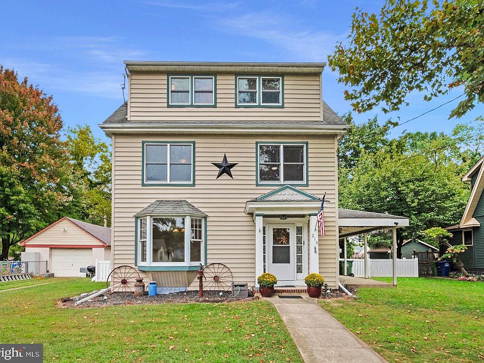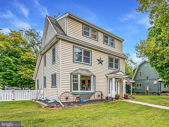 This beautiful 4-bedroom colonial offers an abundance of space, charm, and modern updates, perfect for today’s homeowner. On the main level, enjoy the timeless elegance of hardwood floors throughout the expansive living and dining rooms. Bay windows fill the dining area with natural light, making it a perfect spot for family meals and entertaining. The expanded kitchen is a chef’s delight with a double oven, gas stove, granite countertops and a double sink. The eat-in kitchen area is open to a cozy family room with vaulted ceilings as well as convenient access to a laundry room and half bath. The primary bedroom suite spans the entire third floor, offering unmatched privacy, a luxurious walk-in closet, and a large full bathroom complete with a walk-in shower and jetted tub, creating a serene retreat. The second floor includes three generously sized bedrooms, a full bath, and a bonus room—ideal for a home office, playroom, or potential fifth bedroom. The newly carpeted staircase and landing add a fresh touch to this level. Sliding doors from the kitchen lead to a large, fully fenced yard ideal for outdoor dining or a fire pit. The shed offers extra storage and is conveyed as-is. With rear access from Elm Street, there's potential to add a garage, further enhancing the property's value. On the side of the house relax on the charming, covered porch, with convenient access from both the laundry room area and living room. Located just one block from the Delaware River, this home is perfect for leisurely strolls, scenic sunsets, and even sailboat races. As an added bonus, the school district offers full-day Pre-K for 3 and 4-year-olds. With low taxes ($6,900 annually), and easy access to bridges and public transportation, this home offers incredible value and convenience. Don’t miss the opportunity to own this stunning home in a quaint river town community!