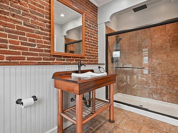 - Description: full bath with exposed brick, mahogany and copper accents