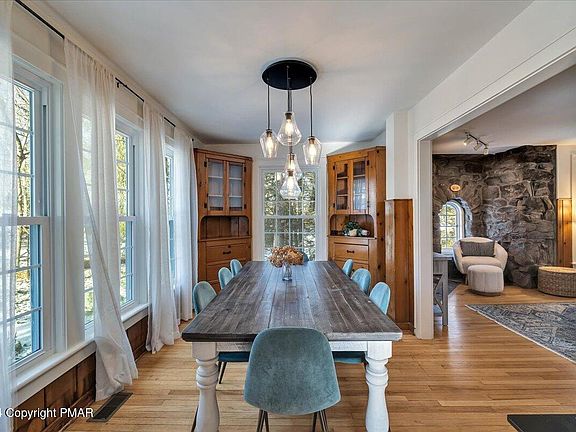 Property is Under Contract and considering back-up offers only at this time. Traditional Buck Hill Falls cottage originally built in 1902 and lovingly maintained and restored over the years. Unique and beautiful stone fireplace with arched window in the living room. The main level also has a charming dining room with built-in cabinets, updated kitchen, den, screened-in porch and new replacement windows. The 2nd floor has 4 charming bedrooms with hardwood floors and 2 baths. The lower level, partially above grade, has a family room/gym, mudroom, full bath, laundry and over-sized 2-car garage with lots of storage. New heat pump HVAC system with 3 zones, tankless hot water heater and new electric panel in 2023. Hardwood floors, pine wainscoting and multiple Dutch doors add to charm.