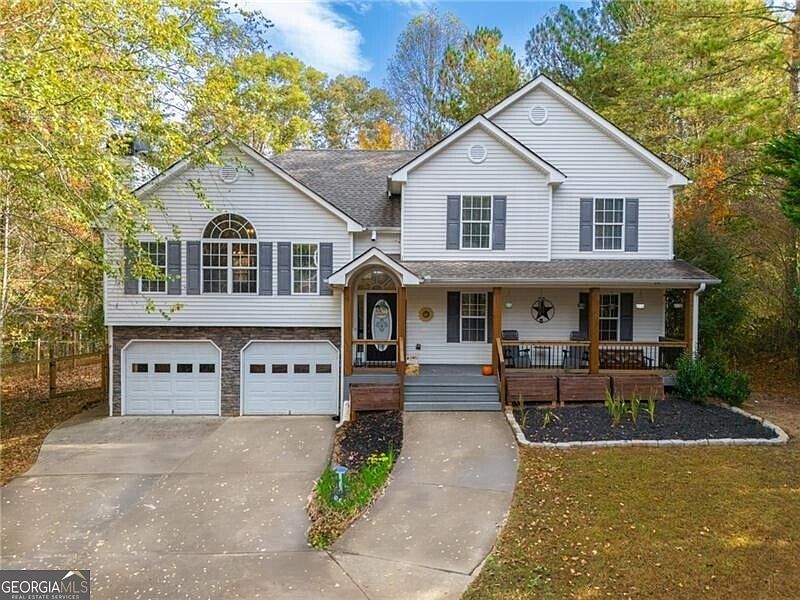 Welcome home to a 4-bedroom, 3-bathroom home in the Cagle Shoals Subdivision situated on a .94 acre private homesite. The rocking chair front porch invites you to relax and take in the serene setting. Upon entering the home you will find multi level living spaces. The great room features a cathedral ceiling with a stone fireplace and is open to the dining area/kitchen offering a seamless flow for entertaining. The kitchen features painted cabinets, an island, a walk in pantry and a door that leads to the back deck. The primary suite provides a peaceful retreat including a sitting room and a primary bathroom with double vanities, a garden tub and a separate shower. 2 additional bedrooms and a hall bathroom are located upstairs as well. The lower level includes a family/recreation room, an additional bedroom, full bath, and a laundry room with access to a covered porch. The oversized 2 car garage has built-in shelving for storage and a custom mobile work bench on wheels. The tree-lined fenced backyard adds a sense of privacy and tranquility overlooking the HOA owned undeveloped 20+ acres including hiking trails. Do not miss the opportunity to tour this home located in an excellent school district just minutes from downtown Waleska, Reinhardt University, Callahan Golf Links and Riverstone Parkway shopping and restaurants.