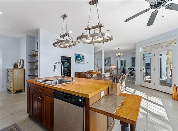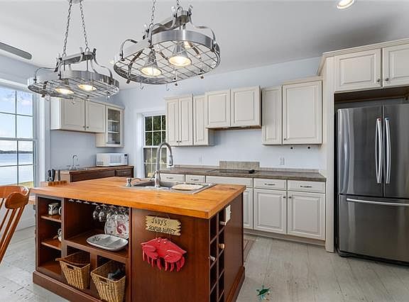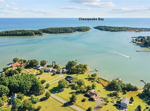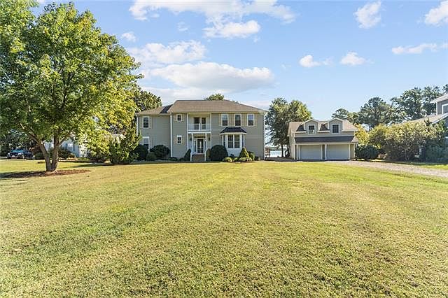 This incredible custom home has beautiful wide views of the Little Wicomico River looking right at the jetties where the river meets the Bay. A grand open floor plan on the first floor with water views and access out to the waterside deck, wood floors, tall ceilings. First floor master bedroom with water views, en suite with walk-in closet, tiled shower, soaking tub and double vanity. Second level has another large living space with access to the 2nd level balcony, a large master bedroom en suite with walk-in closet, tiled shower and guest bedroom and third full bathroom. There is tons of natural light and water views from almost every room. The dock has quick access to the Bay and stairs down to the sandy shoreline. The detached garage offers a full room above. A lovely community and amazing location by water. Quick access to gorgeous beach just outside the jetties only accessible by boat. See floor plans in photos.