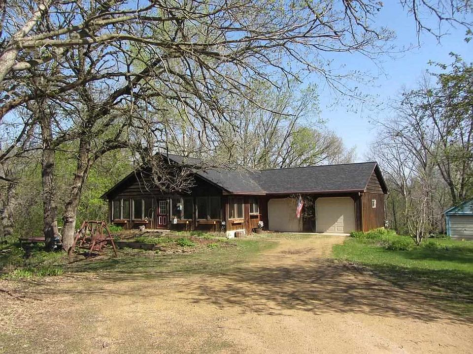 Perfect little retreat situated in a wooded area overlooking Chankaska Creek just on the edge of Kasota. Attached double garage plus an old detached garage for storage. This chalet-style home features 2 wood-burning field stone fireplaces ( in living room and basement family room), main floor laundry (in kitchen closet), dining area, 1 bedroom PLUS a lofted second story room with skylights that could be turned into a 2nd bedroom. You'll love the three-season front porch! The walk-out basement is mostly unfinished, but has a spacious family room with fireplace. Private well and septic. The land with house is about .96 acres, PLUS it includes a small triangle of land (.09 acre - Parcel # 18.40.1800)) next to E. Spring Street. (see map at house). There's a ramp in the attached garage, making it wheelchair-accessible. This is such a peaceful setting for someone looking to live in a wooded setting but close to town.