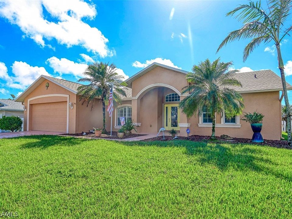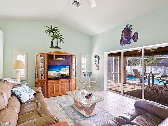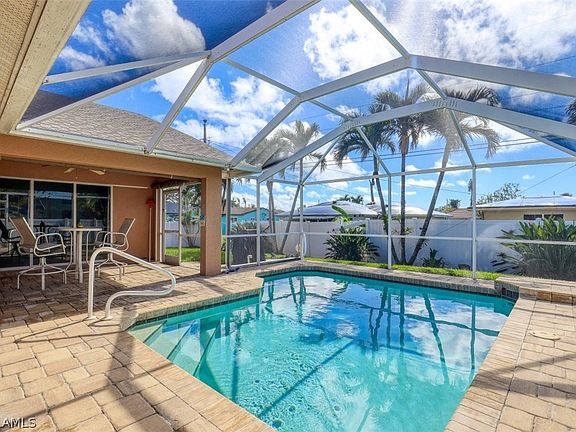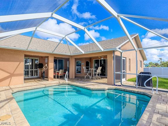 Picture perfect pool home here in Southeast Cape Coral! This home has been very well maintained by the original owners with a new shingle roof, manicured landscaping, and a fresh coat of paint. Walking into the open floor plan home, you will find cathedral-style ceilings and new paint all around the home. The large kitchen overlooks both the living room and the breakfast room. Through the backdoors is the private pool with tons of space to entertain. This Rock Solid home had no roof or interior damage during Hurricane Ian, thanks to the Shutters (manual) and the Kevlar Drop Down panels all across the back of the home. The back fence had one panel damaged, however the owners are fixing it. This home is perfectly located right off Cape Coral Parkway, and offers grocery/shopping/dining right around the corner.