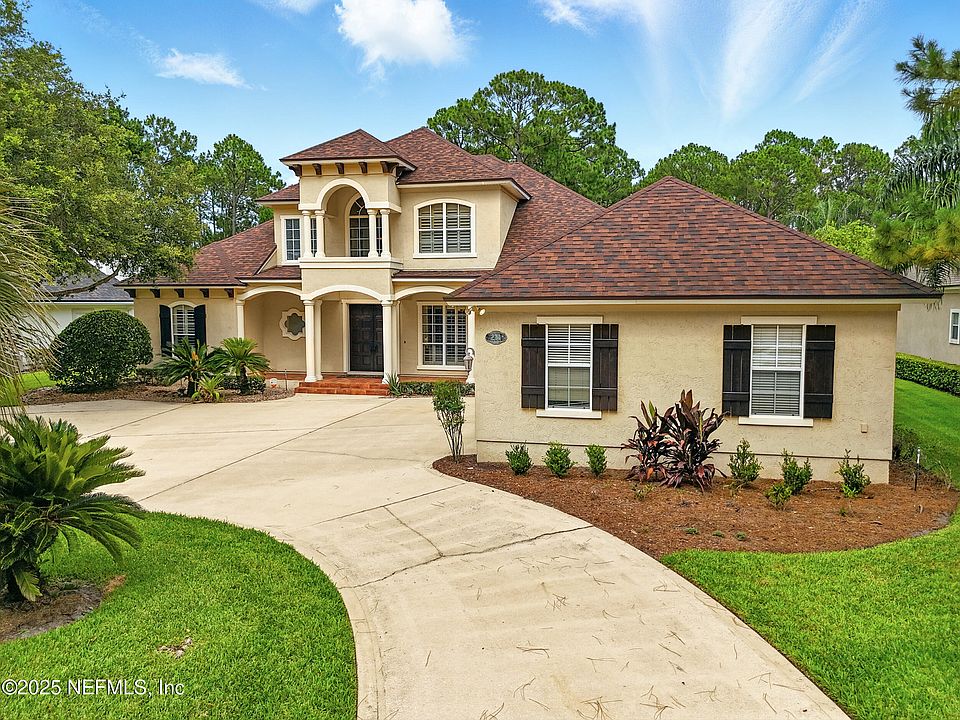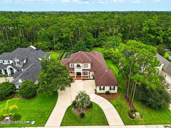 Timeless elegance meets quality construction on an executive, private lot in gated golf & tennis community PALENCIA. This stunning, well-maintained custom POOL home with spa and outdoor kitchen is nestled on a serene preserve. Outstanding features make arriving at 218 Sophia Terrace special, as the home has a circular driveway with extra parking and a three-car garage. A porch awaits, perfect for cozy chairs, and then you step into a two-story grand foyer. New wide-plank hardwood flooring is throughout most of the downstairs. When you walk through the solid-wood double doors, you are greeted with a view of the formal dining and living room and straight ahead, the pool/spa/grilling area/large yard is visible. It's a true outdoor oasis! The kitchen is spacious with seating for 8 at the counter plus a quaint breakfast nook with a double-sided fireplace. Stainless appliances and a gas cooktop make cooking a delight. Multiple sliding glass doors brighten this area, where a built-in bookcase feature wall brings drama and function to the great room. This nearly 4,000 sf home has 4 bedrooms and 4 full bathrooms, but a dedicated study on the main floor could be a FIFTH bedroom as it has a closet, windows and it has a door to the front porch as well. The master bedroom is elegant, with high, tray ceilings, hardwood floors, a large bathroom with tile shower and jacuzzi tub. Also downstairs is a guest suite/bath combo in the back of the home, allowing for privacy. Upstairs, there are two bedrooms, a Jack-and-Jill bathroom, and a large bonus room with pocket doors. Each room has oversized, walk-in closets. Upgrades include: New HVAC systems, new hardwood flooring, new carpet, a completely resurfaced pool with stacked stone accents, painted pool deck, epoxy garage coating, tankless water heater, water softener and reverse osmosis drinking water system, roof 7 years old. All of this, within the luxury community of Palencia full of amenities and its scenic walking trails, gym with classes, heated lap pool, tennis & pickle ball courts, championship golf club, and top-rated Elementary School, as well as convenience to historic downtown St Augustine. Neighborhood entrance has coffee shops, a Publix, salons, UPS, and restaurants. Don't miss the opportunity to own this exceptional home in one of St. Augustine's most sought-after communities.