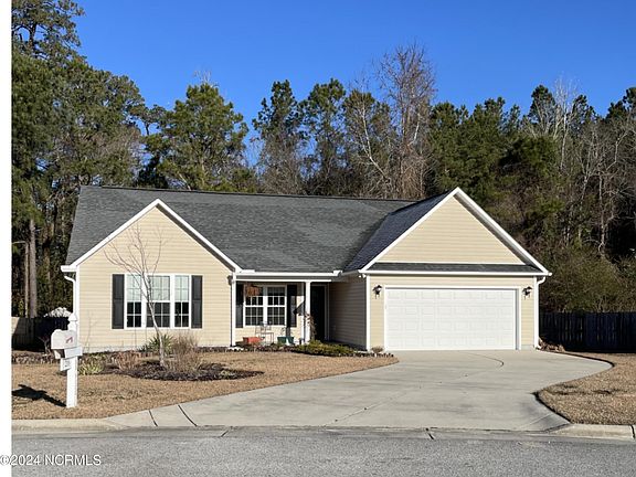 Well-cared for 3 bedroom, 2 bath home in the desirable Croatan Crossing neighborhood. Minutes from Cherry Point gate. Master bedroom at rear of house has a tray ceiling with large walk-in closet and double vanity bathroom. Split design with other bedrooms up front. All bedrooms have new carpet from 3 years ago. Many rooms have fresh paint. Luxury vinyl plank throughout. Ample storage with a closet in laundry room, coat closet and linen closet. Attic storage via pull-down stairs in garage. Garage has finished/painted walls and painted floor. Backyard is fully fenced backing up to the Croatan National Forest. Landscaping includes native plants for birds and pollinators. NO CITY TAXES! Great neighborhood with a true community feel.