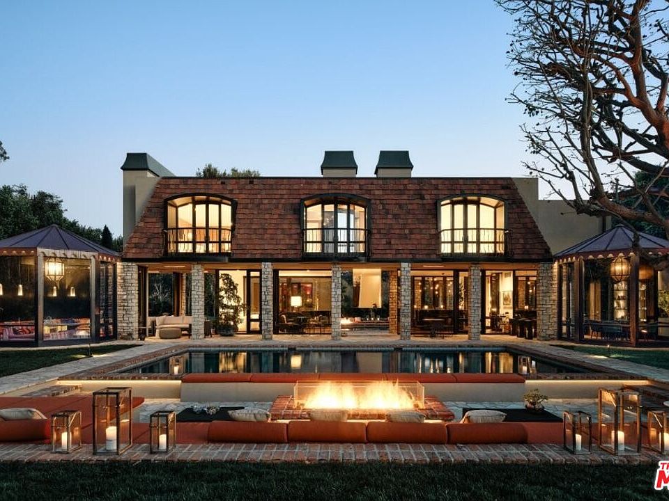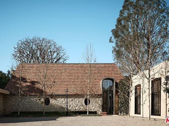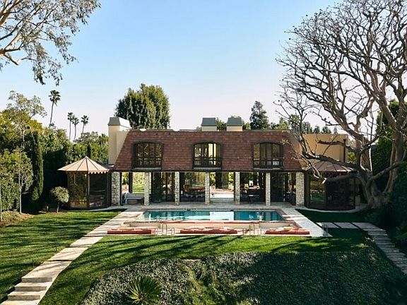 This Bel Air John Elgin Woolf-designed residence, his personal home, is one of his finest restored works. Known as the Father of Hollywood Regency, Woolf's iconic design is a key piece of LA architectural history. Jack Wolf masterfully blended traditional and modern design for a unique, glamorous style. Restored and reimagined by RIOS under Mark Rios FAIA FASLA and featured in Architectural Digest, this 8,400sf gem blends timeless elegance, fresh modern elements, bespoke upgrades and refined spaces for elevated living and entertaining. Set on nearly three-quarters of an acre behind private gates, soaring hedges and a large motor court, this thoughtfully designed home features 6 bedrooms, 6 bathrooms, 2 powder rooms and striking details like skylights, bold colors, mirrors and glass walls. Iconic Woolf elements in the oval windows and oversized Pullman doors preserve the home's original Hollywood Regency character. The soaring foyer with wood floors and floor-to-ceiling glass walls is flooded with natural light. At the heart of the home, a tranquil courtyard artfully divides the cocktail lounge from the Red Library Room. The spacious cocktail lounge features a sculptural fireplace, anchored by a custom floating black polished bar, built-in shelving, original sconces, sitting area and wraparound glass walls framing the grounds. The Red Library Room features a marble-clad fireplace, herringbone wood floors, bespoke built-ins and floor-to-ceiling shelving, complemented by a 100" TV home theater system for a cinematic experience. This wing also houses two elegantly appointed bedroom suites, each with unique design elements, including vibrant bathroom suites. A main floor third bedroom suite completes the sleeping quarters. The two-story formal dining room features expansive walls for art and an original Woolf antique mirrored ceiling with skylights. Signature Woolf elements, including the original mirrored dining table, anchor the space, preserving Hollywood Regency charm and elevating its grandeur. The sleek, all-black and stainless-steel gourmet kitchen pairs discreet Bulthaup cabinetry with top-tier appliances, an elongated wood butcher block island and a secondary working kitchen. The octagonal breakfast room opens into a glass-walled pavilion with custom cabinetry and serene views. Double doors lead to the swimming pool area with sunken living room, fire pit and Moroccan-inspired glass pavilion. Stone paths lead to a serene koi pond, complemented by a pavilion with outdoor kitchen. Inside, ascend the sculptural staircase, framed by glass walls to the primary suite sanctuary, where a balcony overlooks lush grounds, complemented by dual spa-inspired bathrooms and custom walk-in closets. One bathroom showcases bold black marble, textured wall coverings and a spacious closet, which connects to an adjoining bedroom suite (currently an office). The second bathroom dazzles with white marble, a custom Rios-designed stone soaking tub, a marble vanity and walk-in closet with chic dressing room and elevator. Additional amenities include a wine room, separate fully equipped gym with en-suite bathroom (can also function as a guest suite), house manager's office, utility room and a two-car garage, all enhanced by state-of-the-art integrated music, entertainment and lighting system. The property also offers a rare opportunity for an accessory building or ADU with a separate street entrance. This home presents a distinctive yet very comfortable way to live, offering refined living and tranquility within this exclusive enclave of Bel Air.