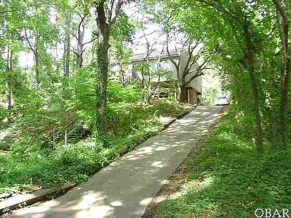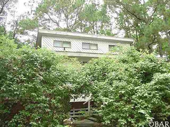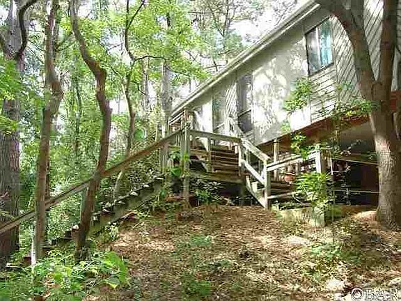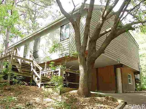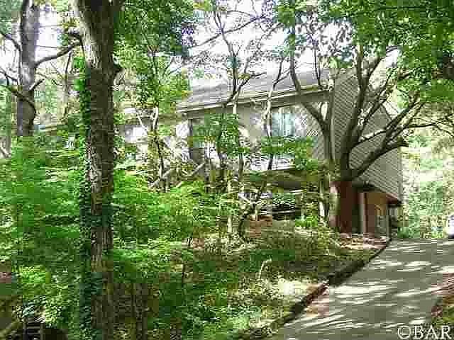 Charming home on elevated, wooded homesite. Feels like a "tree house" at times, the home is nestled on a hill high above the road. The property is quiet and private surrounded by trees and mature vegetation. Decks on 3 sides of the home really take in the natural setting. Home is 2 bedrooms, 1 bath and has a large living room with vaulted ceilings, eat in kitchen and loft. Hardwood floors throughout, custom trim and walls, beamed ceilings and built-ins add to the simple and charming feel of this home. Under the home is a carport and storage room. This is a very unique Southern Shores property!