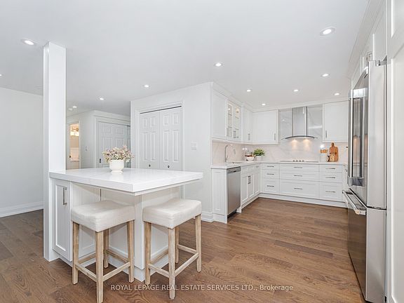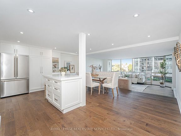 Welcome to a rare opportunity to live in the heart of Bronte Village, one of Oakville's most sought-after waterfront communities. Set on five acres of meticulously landscaped grounds, this newly renovated suite is nestled within the prestigious Ennisclare II on the Lake, offering resort-style amenities and a sophisticated lifestyle. Be the first to call this beautifully reimagined condo home. Enjoy breathtaking lake views from your private balcony and a thoughtfully designed open-concept layout that seamlessly combines comfort and elegance. The spacious living and dining areas are perfect for entertaining, featuring custom built-in cabinetry, wide-plank flooring, and stylish pot lighting throughout. The Perola kitchen is a chef's dream, with quartz countertops and backsplash, under-cabinet lighting, brand-new stainless-steel appliances all curated with impeccable attention to detail. The kitchen has pot and pan drawers, glass cabinets, a large pantry/bar, and island with additional drawers and storage. The cabinetry continues into the dining room with shelving and glass cabinets as well as entertainment cabinets in the living room The suite boasts two generous bedrooms and two luxurious bathrooms, along with a convenient in-suite laundry area complete with new washer, dryer, and overhead cabinetry. Residents of Ennisclare II enjoy exclusive access to the impressive array of amenities, including an indoor pool, state-of-the-art fitness centre, sauna, tennis and squash courts, party and billiards rooms, a golf driving range, art room and workshop and a welcoming residents lounge. All utilities are included in the condo fee heat, hydro, water, cable, and internet offering exceptional value and peace of mind. Only a phone is extra. This turnkey residence also includes one underground parking space and a private locker. The building also has recently install infrastructure for owners to be able to have a car charger installed.