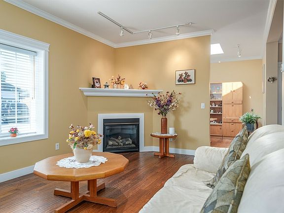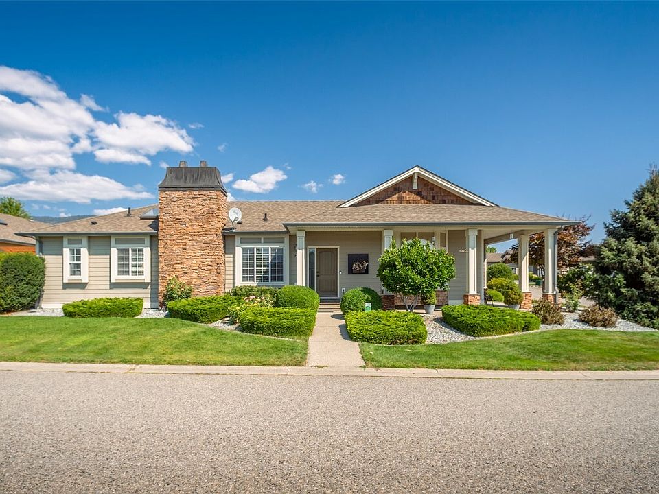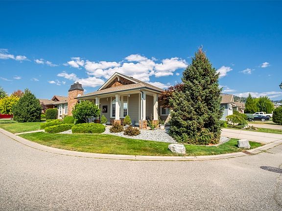 Meticulously kept 2 bdrm/2bath PLUS den home in a vibrant 45+ gated community. One of the first show homes & located on a quiet street just through the gates & close to the clubhouse! It sits upon a desirable corner lot & is beautifully landscaped! The lovely living rm w/gas fireplace & a large window leads to the spacious den (being used as dining rm) w/incredible skylight providing an abundance of natural light! The dining rm is situated between the kitchen & primary bedroom w/doors leading to the private, no maintenance backyard. The primary bedroom is a great size & incl. a walk-through closet & 3pce ensuite. The impressive kitchen incl. maple cabinetry, pantry & coffee bar, s/s appliances w/gas stove & gorgeous granite countertops w/eating bar! The second bedroom on the opposite side (used as tv room) is right beside the main 4 piece bathroom. Access to the single garage w/storage from laundry room provides easy access! The private backyard space incl. a well-built pergola offering versatile shade & newer fencing! ADDED FEATURES: 9FT ceilings, new furnace, new hot water tank & new air conditioner, granite countertops throughout, crown moulding, newer washer/dryer & immaculate hand-scraped hardwood flooring throughout! Clubhouse w/amenities (gym, pool table, library & guest kitchen). Located across the street from Two Eagles Golf Course & the 19 Okanagan Grill + Bar! Only a couple minutes to Okanagan Lake, shopping, restaurants, recreation centre, Walmart, Superstore & more!
