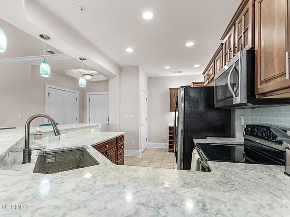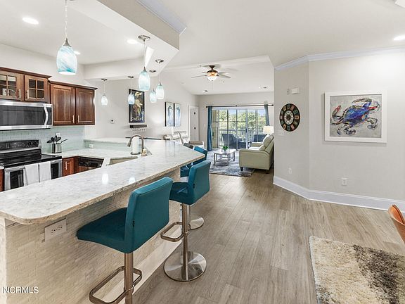 Welcome to Edgewater in Barefoot Landing, where luxury meets coastal elegance in a private, gated community along the Intracoastal Waterway and the Norman golf course. This exquisite, fully furnished residence includes a transferable membership to the Barefoot Golf Resort and the four world-class golf courses. Step into the top floor unit which features open design, vaulted ceilings and upgrades throughout. The gourmet kitchen has beautiful Montgomery quartz countertops, hand-blown pendant lighting, recessed lighting, and stainless steel appliances. The panoramic bar is perfect for casual dining, wine and tapas tastings and elegant entertaining.The gourmet kitchen extends into the complimenting serving bar with custom cabinetry, large pantry and built in stainless steel beverage refrigerator. The exquisite kitchen flows seamlessly into the formal dining area and living room, all adorned with tasteful coastal art and neutral accents. High quality leather reclining couch and love seat flow into the cozy screened lanai with new tile flooring and ceiling fan. The lanai boasts a terrific unobstructed view of the Greg Norman course. Retreat to the master suite, which features a tray ceiling, plush upgraded carpeting, and dual spacious closets. The dual reclining king bed in the master bedroom has two twin XL mattresses that are independently adjustable. The luxurious ensuite bathroom features a whirlpool tub, separate shower, and dual vanities for ultimate relaxation. Two additional bedrooms, each with vaulted ceilings and ceiling fans and a fully second bathroom provides comfort and privacy for family or guests. Upgrades throughout the unit include plantation shutters, decorative molding, and wide baseboards. Convenience features include a newer washer and dryer, fresh paint, and two storage units—one on the same floor and another in the garage. Enhanced security measures, including coded building entry, ensure peace of mind.