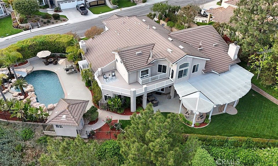 The Heatherwood Viewpoint Estate! This one has it all.! A wonderful opportunity to own a stunning near 5000 sf, 6 bedroom plus loft, bar and gameroom, 5 bathrooms, 4 car garage plus RV parking all on a near 3/4 acre lot. Amazing panoramic views including sights of Catalina, hills, mountains, city lights and sunsets. This corner lot property has impeccable attention to detail throughout. Walk into a tall entry with vaulted ceilings, a classic living room with fireplace, imported Australian ironwood mantle, French doors to side yard overlooking your own private oasis with pool house, sauna and rock pool/spa with waterfalls and slide, a large private dining room with chandelier and large view windows, a gorgeous kitchen with large island topped with leathered granite, stainless steel appliances including built in GE Monogram fridge, double oven and more, custom cabinetry with brushed nickel hardware, walk in pantry, banquette seating, adjacent to the massive beamed cathedral ceilings family room with built ins and large fireplace and spacious game rooms complete with step down bar sink, fridge and ice maker, granite countertops, downstairs bedroom/bath plus oversized laundry room with folding/wrapping stations and chute, mud room, elegant textured ceramic tile plank flooring, enjoy the custom dual staircase design including a grand front wrought iron staircase, upstairs offers 5 bedrooms, 3 bathrooms, a loft and a wrap around balcony with captivating views, a truly special primary suite with high ceilings, mirrored ceiling entry, fireplace with stone accents, spectacular views, a primary bathroom to die for with a free standing tub, marble shower with mosaic inlays, dual sinks and walk in closet, large secondary bedrooms with ceiling fans, mirrored wardrobe doors and shutters, enjoy appointments of crown molding, plantation shutters, intercom, surround sound, jandy pool controls, 4 car attached garage with epoxy flooring, built ins, workbench and water softener, RV parking on sideyard, 3 HVAC's, solid core paneled interior doors, whole house instant hot water, adt security app, outdoor seating and eating with built in BBQ and alumawood patio cover, no hoa, no mello roos, award winning schools & a large neighborhood park closeby. Welcome Home!