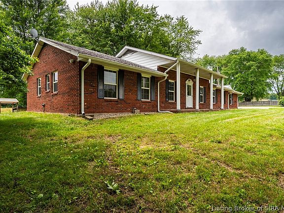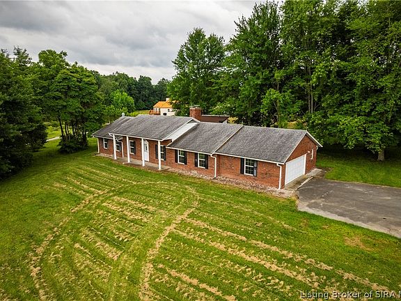 Welcome to your dream rural retreat in Southern Indiana! This expansive single-level brick ranch, nestled on 5.04 acres of pristine farmland, features 4 bedrooms, 3 full baths, and a 2-car attached garage. The property boasts versatile outbuildings including a 200 sqft 2-level sunroom, storm shelter, and a 3,350 sqft pole barn with 4 stalls, a tack room, and an additional 4-stall horse shed, perfect for equestrian enthusiasts or hobby farmers. Thoughtfully remodeled throughout, enjoy peace of mind with modern updates such as a newer roof, kitchen, septic system, HVAC, electric water heater, PEX plumbing, double-pane vinyl windows and doors, a skylight, fresh paint, and solid hardwood oak floors with carpeted bedrooms. Move in immediately and experience the tranquility and beauty of Southern Indiana living, or continue customizing this remarkable property to create your ideal rural haven.