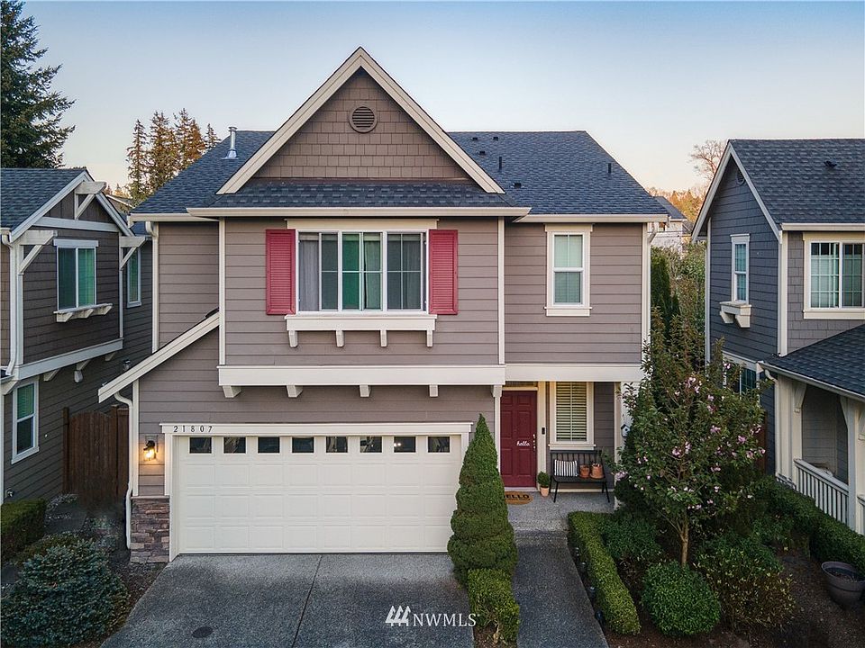 Remarkable well-maintained tons of natural light, Kimura Gardens resale! Detached, 4 bedroom 2.5 bathrooms . Kitchen has New Quarts counters/backsplash, gas stove, SS appliances, pantry & an island w/seating. Includes, "The Frame, Samsung TV" in living room with custom fireplace and shelves. Upstairs are 4 spacious bedrooms, including the gorgeous master with a retreat, 5-piece bath & walk-in closet. Plenty of storage. Fully-fenced backyard w/a stone water feature. HOA covers yard care, sprinkler system for front of house. Newer paint, New carpeting, A/C, washer, dryer, private parks and trails. High rated Northshore schools. Easy access to 405/I-5, shopping and restaurants