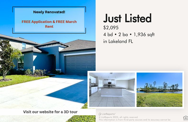 ** New listing with 10 Stars Property Management ** Beautiful 4 beds 2 baths is available for rent in Lakeland, FL. Located in Lakeland, 2181 Old Mining Road offers convenient access to the area's key attractions and amenities. Nearby, you'll find the expansive Lake Parker Park, ideal for outdoor activities like fishing, picnicking, and sports. Downtown Lakeland is just a short drive away, featuring attractions like the Polk Museum of Art and Lake Mirror Promenade. The property is conveniently located near major roads, including U.S. 92 and State Road 570, providing easy access to Tampa and Orlando. With shopping centers, dining options, and recreational areas close by, this location combines tranquility with convenience. 3D Tour Available: APPLY NOW AND GET FREE RENT FOR MARCH Features: - Application fee will be credited back on the 1st month of rent if approved - Newly built in 2022 for modern style and features - Bright and spacious living area seamlessly connected to the kitchen for an open feel - A mix of tile and carpet floorings for style and comfort - Modern kitchen with stainless steel appliances for a sleek cooking experience - Dishwasher for effortless post-meal cleanups - Center island for additional prep space and casual dining - Ceiling fans and window coverings throughout for comfort and privacy - Master bedroom with own master bath and walk-in closet for a private retreat - Washer and dryer included for convenience and hassle-free laundry - Car garage for secure parking and added storage - Pretty driveway that adds charm upon arrival - Bathtub and standup shower for relaxing and versatile bathing options - Lake in the back for a peaceful and scenic view - Tenant is responsible for paying all utilities and lawn care Pets are allowed. No more than 2 pets per property. Weight limit of 55lbs per pet. No aggressive breeds. Applicants must complete a free pet application and have animal approved with vaccination record. The monthly pet fee will be determined by your pet screening score. Does not apply to medically/emotional support prescribed and/or service animals. At 10 Stars, we offer multiple services to make your stay with us easy and comfortable. We have a same-day application approval and a quick move-in for no additional cost. Our team is professionally trained and will be able to assist with any leasing, billing, or maintenance issues our tenants have. We also offer an emergency line available 24/7 for any urgent cases. Tenants have access to an online portal where they can make rent payments, communicate with our team and get updates on their payments and maintenance requests at all times. THE FIRST MONTH AND SECURITY DEPOSIT ARE REQUIRED Renter's insurance is required prior to moving in. Rules and Regulations are on our website! Only $65 non-refundable application fee per adult with 10 stars property management