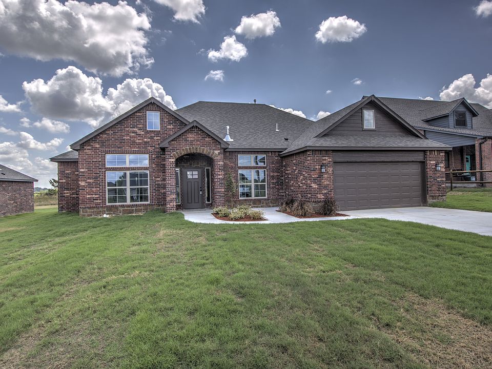New Construction, open concept, Living with fireplace open to kitchen with granite, split bedrooms, master w/ office area, utility w/cabinets, master bath w/2 vanities, walk-in shower and whirlpool tub, Covered porch and patio, close to school and view golf course.