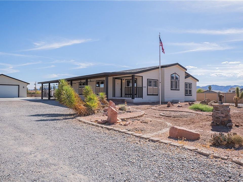 You will love this amazing 4 bed, 2 bath home with over 2,100 sqft that sits on a huge 1+ acre lot on a private well. Inside, the open layout and large windows bring in lots of natural light. The two islands in the kitchen are perfect for serving and entertaining guests. Pick up a book or enjoy an afternoon nap in the sunroom off the kitchen. Outside, there’s a storage shed, a large, extended driveway for plenty of parking, RV plug-ins, and even a place to play horseshoes on those cool fall evenings. The covered patio and shaded pergola provide more space to soak in the quiet. The detached 2-car garage features a built in compressor for workshop use and an extra room ideal for extra storage, a craft space, or guest room. With the expansive open lot, build yourself additional RV parking, a hen house, or add a pool to create your own desert retreat against the vast mountain backdrop. The possibilities are endless. Combining comfort and function, this home is the one to call yours!