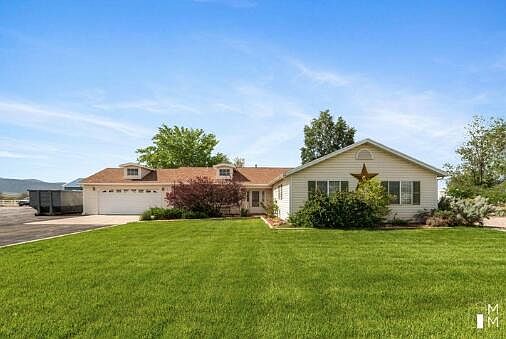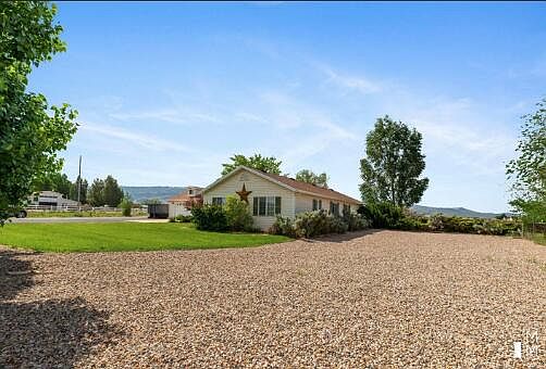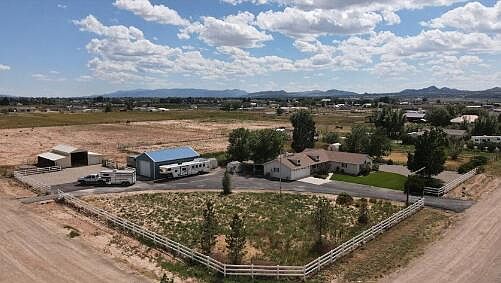 This beautiful home on 5 Acres with an amazing view of the mountains and valley. Oversized 2 Car Garage and an asphalted detached Barn/RV Garage with 38x40 full power, 220 power. 2 Stall metal shed , 4 Stall run in barn with roll up doors. Riding arena and horse pasture in backyard. Home has a large family room with sliding glass doors. Large living room has a gas fireplace. There is a brand new water heater and the home heats and cools very well. Separate fenced yards between 3 & 4 acres of pasture. Outside also features a greenhouse and a covered porch. Everything outside is to be included.