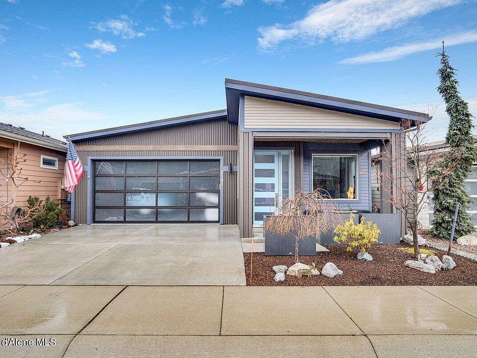Stunning single-level smart home located in the sought after gated community of Riviera Walk. This 2B, 2BA, spacious 1780SqFt home boasts tall ceilings, an open contemporary floor plan, and loads of storage. From the window coverings to the toilets spells luxury throughout. The flex room could be used as an office, den, or a third non-conforming bedroom. Gourmet kitchen with beautiful quartz countertops, large kitchen island, full tile backsplash, large pantry, touchless faucets, new refrigerator, oven and range hood, bosch stainless steel appliances & wine cooler. High End Upgrades: 13 ft. ceilings, upgraded floor to ceiling windows, gas fireplace with beautiful wood accents above, expanded spacious master suite, hardwood and tile flooring. This high-efficiency home includes radiant floor heating, gas fireplace, mini-split HVAC and a 240 outlet for electric vehicle charging in a heated finished oversized garage. This home has views of the community's green space, firework shows, mountains, 500 steps to Spokane River, dog parks. Landscaped with lighting and sprinkler systems in front and back yards, Veradek Planters (on drip), including $9000 iron sculpture on the east side yard, HOA covers snow removal on driveways, streets and sidewalks, this is maintenance free living at its best. Riviera Walk has gated access to Centennial Trail where you can walk or bike along the Spokane river. Enjoy the lively Riverstone communities within minutes of walking distance for restaurants, shopping, outdoor concerts, farmers market and winter fun. So convenient, scores a 10 for walkability.