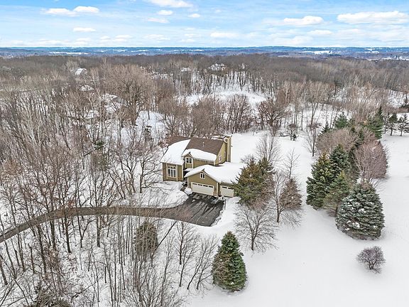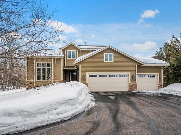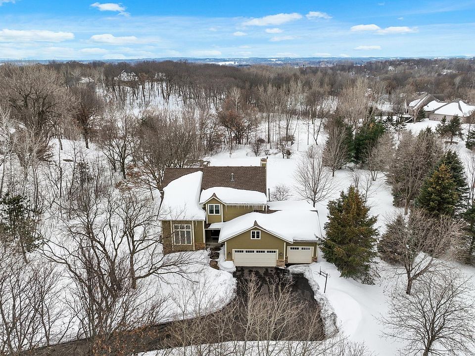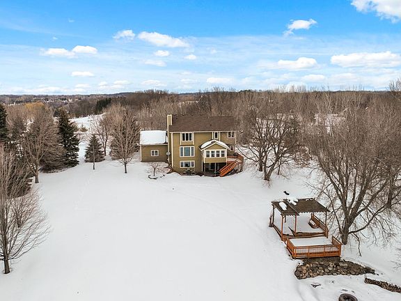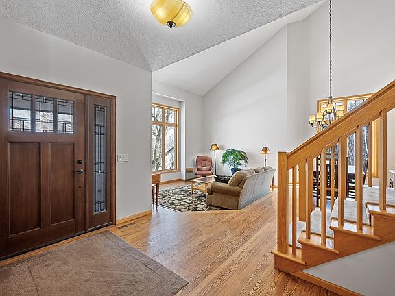 Gorgeous 2 story home on 2.5 acres in Wagon Wheel Crossing. Privacy is a top benefit, as you will be surrounded by nature - enjoy the peace & tranquility of this neighborhood. A winding, tree-lined drive leads to the home and the large, flat backyard offers more private play space. Inside you'll find a spacious and bright open floor plan with plenty of room for your family. The living room, dining room, and foyer have high vaulted ceilings, lots of natural light and gleaming hardwood floors that make a lasting impression. You will love the 3 season porch with its picturesque views, perfect for entertaining or just relaxing! Upper level features a spacious primary bedroom with a luxurious full bath! A large office/bedroom w/interior "window" overlooks the main level. The home boasts a fully finished walkout lower level, paver patio and a 3 car garage. Don't miss the heated workshop located behind the 3rd garage stall. Lakeville schools. Minutes away from shops, restaurants and more!