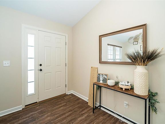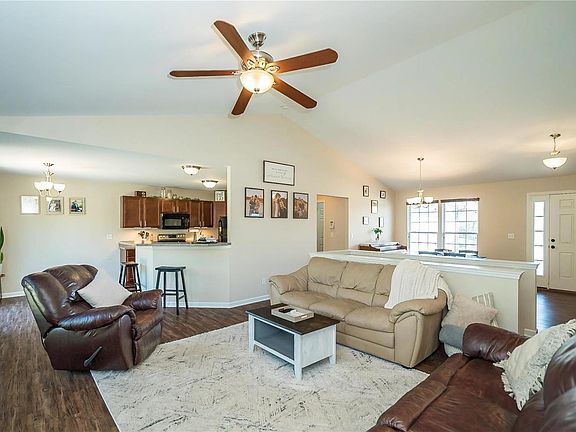 Step inside this neat and tidy ranch and take in the fresh neutral paint and wide open floor plan. The main living area has soaring vaulted ceilings, luxury vinyl plank flooring and a warm, cozy wood-burning fireplace. The elegant kitchen has a breakfast bar, quaint dining area, tons of custom cabinets, brand new dishwasher and a pantry. You'll love the split bedroom floor plan. The primary suite, which is near the main floor laundry, features plush new carpet, walk-in closet, full bath with long vanity & large linen closet. Bedrooms 2 & 3 both have new carpet, fresh paint and share the 2nd full bath which has just been beautifully updated. Chill on the patio by the level backyard that is lined with trees along the back. The lower level with tons of shelves for organized storage is ready to be finished with an egress window and roughed in bath. Peace of mind as this lovely 1568 sqft home is only 11 yrs old!
