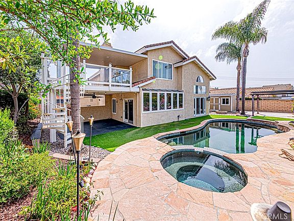 This is it! Amazing View home! This is the house that you have been looking for, but you didn't think you would ever find! Perched in a coveted Yorba Linda neighborhood. Just a short distance from Top-Ranked Yorba Linda High School & Travis Ranch for Elementary & Middle School. This beautifully upgraded home combines timeless style with modern comfort. Enjoy expansive living spaces with designer lighting fixtures, soundproof double pane windows and sliding glass doors, and custom finishes throughout. The spacious kitchen/family room with an open area has fireplace, European granite counters, kitchen island, wine cooler fridge, walk-in pantry, recessed lighting, all matching Thermador brand appliances, under-sink water purification system, and wall to wall windows overlooking the beautiful Pebble Tech Saltwater Swimming Pool & Spa. Gorgeous ceramic tile flooring downstairs, newer central Air & Heat, with a first-floor bed & bath with custom built-in steam Sauna, dual shower heads, and 3 more large beds and 2 full baths upstairs. The Master suite with a high-end brand Jacuzzi/tub, separated shower, double sink with amazing mid-century modern flair & the master bedroom also has a large comfortably sized study that opens to Terrace for you to enjoy the City lights. Too many fixtures to list in this description, like the over-sized 3 car garage with an extended driveway-large enough for the RV Parking w/Charging outlets, Fiberglass Garage doors, custom built-in storage cabinets, EV charger ready 50-amp, Epoxy floor, Water Softner System, new Pool Heating System, covered patio w/ceiling fan, upstairs Terrace w/Composite decking, Insulated Aluminum Roof panels, and metal Spiral staircase to pool area, Attic Cooling System, wet bar, custom Closets & Plantation Shutters, spacious individual laundry room w/sink & cabinets, Fire pit, and custom Shed. Homeowners spent over $200K on remodeling and upgrades. Additionally, an integrated Solar system enhances energy efficiency. "No HOA"