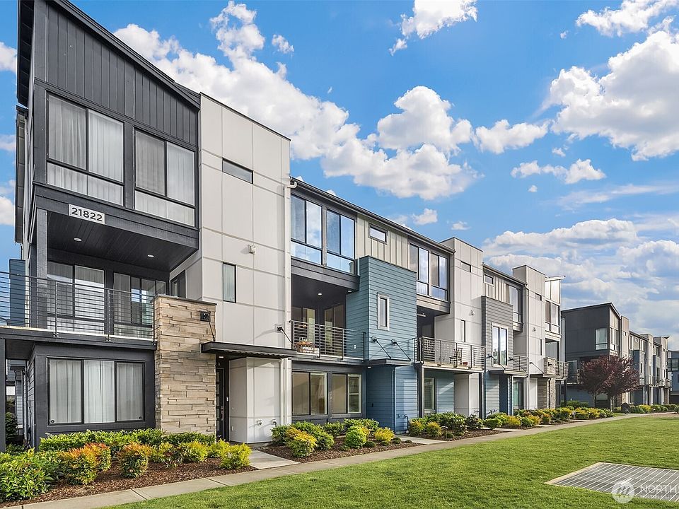 Experience modern living in luxury community w/contemporary architecture & exceptional finishes. This stunning 4BR/3BA residence, ideally situated w/views of central park. Floor-to-ceiling windows & Toll Brothers signature 9 ft’ ceilings flood the home w/natural light. Open-concept main floor showcases chef's kitchen w/abundant cabinetry, large island & SS appliances, flowing to dining area & spacious living room w/cozy gas fireplace & covered balcony w/gas hookup. Primary suite features spa-like shower & walk-in closet. 2 additional bedrooms & hallway bath complete upper level. Guest bedroom w/en-suite bath & 2-car garage w/EV charger on lower level. A/C included! Coveted Northshore SD. Excellent commuter access. Close to all amenities.