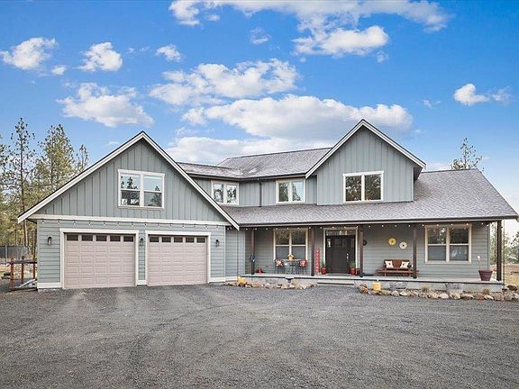Stunning 4 bed/2.5 bath, 3,200 sq ft home set on 10 private gated acres with shop and room to roam. The expansive kitchen shines with stainless appliances, quartz counters, a walk-in pantry, and an inviting dining area. A dramatic floor-to-ceiling chimney with pellet stove anchors the open living space. Main floor primary suite offers true retreat living with a soaking tub, walk-in shower, dual sinks, a spacious walk-in closet and doors out to your back deck. A designated office and main floor laundry/mud room area add everyday ease. Upstairs, an open catwalk leads to three bedrooms, a full bath, and a generous bonus room above the 3 car garage. Enjoy outdoor living on the covered deck overlooking wide-open acreage, plus a concrete sports court for play. Bring all the toys—this 24’ x 30’ powered shop features two 12’ lean-tos, RV clean out and a 30 amp outlet along with a 50 amp plug for your EV. Located in the sought-after Cheney School District, this property blends comfort, style, and acreage living.