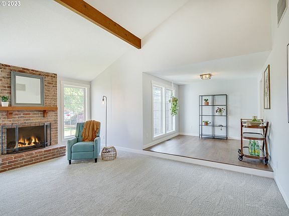 Delightful Contemporary Ranch in Trachsel Meadows. Move in ready with central AC just in time for summer! Super clean single level with beautiful updates and design. Foyer enters to cool sunken living room with vaulted ceiling, exposed beams, brick fireplace and large windows with lots of natural light. Lounge area or second dining area leads to dreamy refinished kitchen with stainless appliances, new disposal and hardware. All new LVP flooring and doors and trim throughout, and complete with stylish bathroom updates. Two sliders head out for great outdoor entertaining with covered patio and wrap around yard. Back gate entrance from Johnson to park and store RV or toys. Cul-de-sac tucked away off main roads, super close to parks, shopping and restaurants; Fred Meyer, brand new Market of Choice in 2024. Minutes to Intel Aloha Campus, to Nike, highway 26.