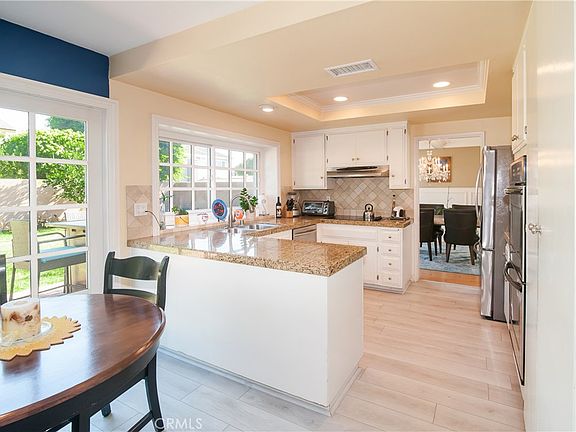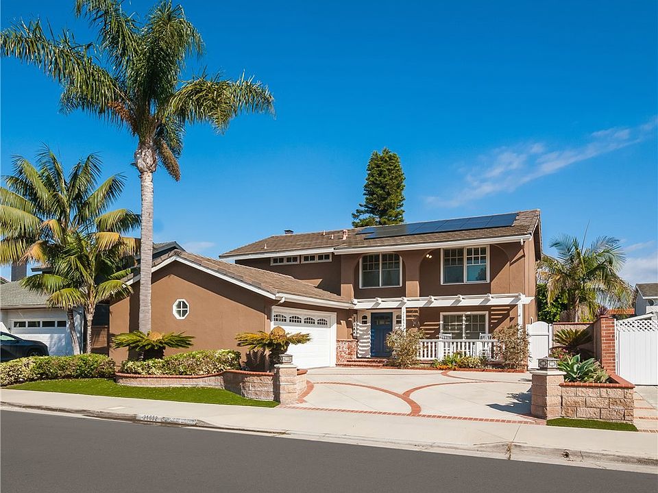 Capturing the true essence of the Huntington Beach “California” lifestyle - This exquisite home has an exceptional floor plan located in South Huntington Beach. Ideally situated within the Franciscan Fountains subdivision, this beautifully designed home flows seamlessly throughout, with over 2600 square feet of living space and a flat useable oversized lot measuring almost 6000 square feet. Upon approach, you are greeted by a stunning front door entrance that leads you into a lovely home that is perfectly laid out. The beautifully sized formal living room sits to the right of the entrance and is adjacent to the formal dining area which is complimented by wainscoting, a gorgeous custom coffered ceiling and french doors leading to the private back yard. Both formal areas are generously sized with plenty of room to entertain. The expansive family room is highlighted by an elegant fireplace, large windows that allows in an abundance of natural light and a sliding door leading out to a relaxing back yard which is perfect for lounging and enjoying your family and friends. The chef's kitchen is equipped with stainless steal appliances, granite countertops and a large garden window. The main floor bedroom is perfectly placed with a secluded entrance and near its own full bathroom. The romantic spiral staircase leads you up to the additional bedrooms with the Grand Master Suite offering its own private office (which can be the 5th bedroom), a considerably sized window and a luxurious master bathroom with dual vanity sinks and a walk-in closet featuring custom built-in shelves. The additional bedrooms are both graciously sized and are wonderfully placed within the upstairs layout. Additional features included: wood and luxury laminate flooring throughout, Crown molding and recessed lighting. Situated less than a mile from the ocean, you now can enjoy all that California has to offer - Welcome home!