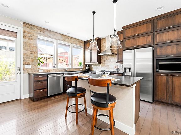 Sophisticated style flourishes in this residence situated within Midtown at Clear Creek. A covered front porch invites entry further inside to an open floorplan flowing w/ sleek design details and harmonious flooring. Enjoy relaxing in a bright living room featuring a cozy fireplace and built-in shelving. The dining area meanders into a large kitchen flaunting stainless steel appliances, beautiful wood cabinetry and a custom pantry. Upstairs, a versatile loft offers space for a home office. Escape to a primary suite featuring a spa-like bath w/ a walk-in shower. Two additional upper-level bedrooms share a full bath. Downstairs, a finished basement features a rec room, a fourth bedroom and a bath. Extend gatherings outdoors to a professionally hardscaped backyard featuring a paver patio and a hot tub. Custom upgrades include a tankless water heater, surround sound, HEPA filtration and smart thermostat systems. A central location affords easy access to an extensive park and trail system.
