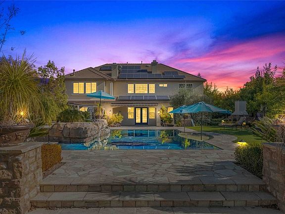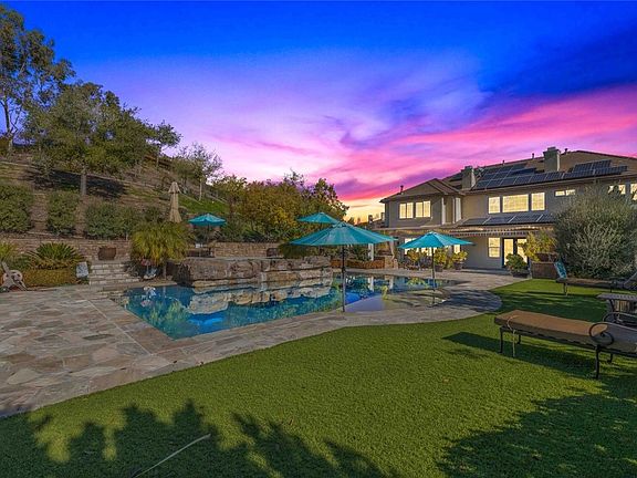 Ultra-Luxurious Two-Story Home with Tropical Poolside Oasis! Idyllically situated on a 1-acre lot in an extremely sought-after gated community, The Retreat. This 5BR/4.5BA, 5,684 sqft residence offers majestic appeal with stunning Spanish-inspired architecture, lush mature landscaping, a circular driveway, and a charming front courtyard. Sumptuous design details are evident throughout the meticulously maintained interior, which dazzles with soaring foyer ceilings, a sweeping staircase with wrought iron, custom millwork, an organically flowing floorplan, an elegant formal dining room, a spacious living room, and a sitting room with a gas fireplace. Equally as bold and stunning, the open concept gourmet kitchen features premium stainless-steel JennAir appliances, custom cabinetry with built-in lighting and underlighting, a 6-burner gas stove, a convection oven, two center islands, breakfast bar, a tile backsplash, a built-in refrigerator, a huge pantry, a breakfast nook, and an adjoining family room with a cozy gas fireplace. Impress guests in the fully enclosed backyard (no back neighbors), which provides limitless entertainment potential with a Pebbletek swimming pool, a jacuzzi, park lighting, inground Bose speakers, a golf putting green, casita with full bathroom, an outdoor kitchen with BBQ, a koi pond with fish, a Japanese garden, and a variety of fruit trees (pear, apricot, lemon, orange, and olive). A viewing platform situated at the top of the property offer spectacular views of the Cleveland National Forest. Magnificently oversized for the ultimate life of leisure, the primary bedroom further delights with custom ceilings, a romantic fireplace, two walk-in closets, and an en suite featuring a deep soaking tub, dual shower, and two vanities. Each guest bedroom provides exceptional comfort with a walk-in closet, while one bedroom also boasts built-in bunkbeds. Other features: double-split 2-car garages with epoxy flooring, laundry room, game room, loft, new water heater, drop-down attic door, attic fan, custom hand carved woodwork throughout, automatic window shades and more! One of the garages features separate air conditioning and heater. Near shopping, parks, hiking trails and the new Riverside Medical Center. Call now for a tour! Buyer to assume Solar Lease