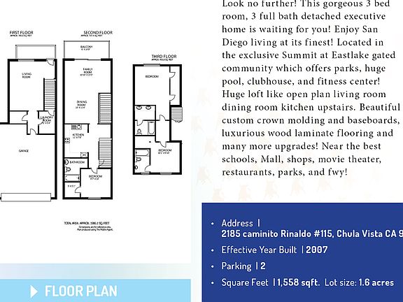 This 1558 square foot townhome home has 3 bedrooms and 3.0 bathrooms. This home is located at 2185 Caminito Rinaldo UNIT 115, Chula Vista, CA 91915.