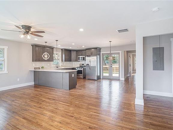 Total renovation! This brick ranch has been taken down to the studs and given everything new - large addition, roof, front porch, deck, plumbing, electrical, HVAC, bathrooms, kitchen, fixtures, insulation, ect. Walls were removed to create a wide-open floor plan between kitchen, living room, and dining room. Gorgeous high-end kitchen has all new cabinets, quartz countertops, island seating, SS appliances, and pantry. New owner's suite addition has 2 walk-in closets and an ensuite bath with double vanity and walk-in shower with frameless glass. New and refinished oak hardwoods throughout. Fully fenced private backyard with deck and secure parking behind the gate.