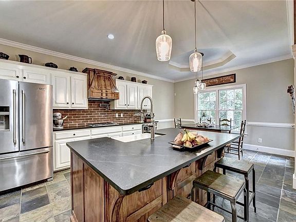One of a kind custom home w/covered front porch! Remodeled kitchen w/ leathered granite, Chip & Joanna cabinet storage island, brick backsplash with pot filler, slate floor and white cabinets. Master on main to office. New roof, new HVACs. Nest t'stats. NEW Hardwood floors, foyer & formal dining. 3 bedroom on 2nd floor w/ remodeled upstairs bath. Finished basement w/cozy tv room, large rec room, private office unfinished workshop. Deck w/ outdoor kitchen. Private backyard w/firepit. Covered porch basement level. Peachtree Ridge top rated cluster. Check out the party lights in the back! Convenient to shopping, I85 and he performing arts at the Gwinnet Arena. Beautiful quiet cul-de-sac street. THIS HOUSE COMES FULLY FURNISHED.