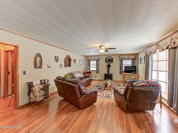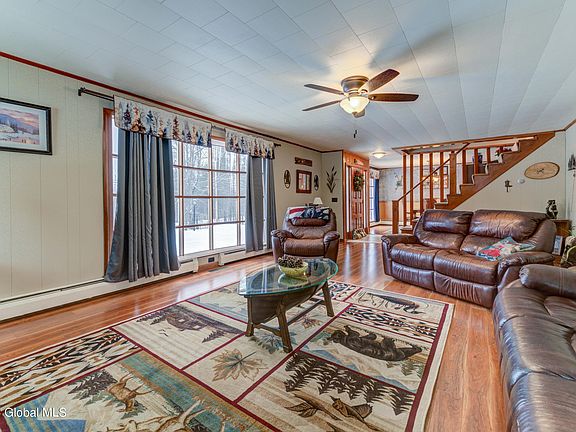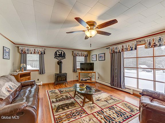 This bright, well maintained home sits on 6 acres of land in the town of Lake Pleasant in the lake pocketed region of the Adirondack Mountains!. It has 4 large bedrooms, walk in closets, and 2 smaller bedrooms that could function as an office or den. 2 master suites make this an ideal 2 family vacation property or excellent short term rental. The large living room has bay windows let in much natural light and a newer propane stove to keep you cozy in the cooler months. Circular drive winds up around house to back door, large property (6 acres). 2+ bay garage, full basement w/woodstove. Whole house generator. Furnishings negotiable. MUST SEE!