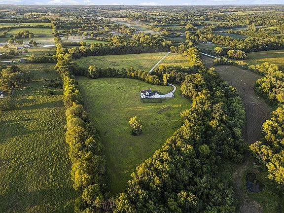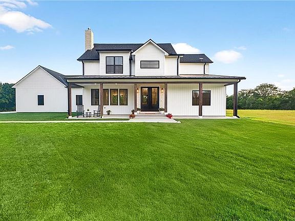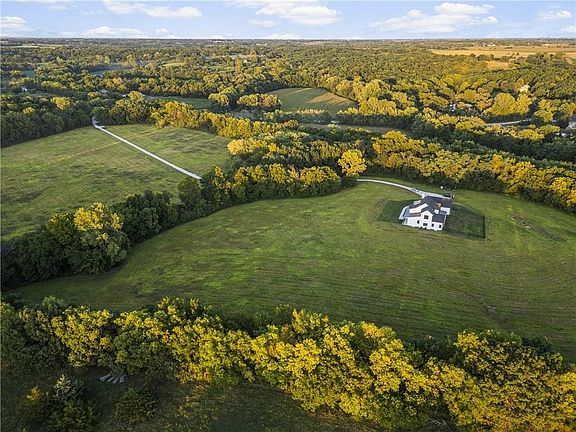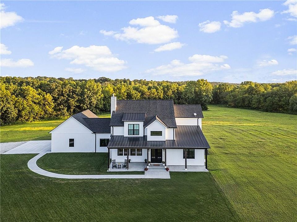 Discover modern country living at its finest in this brand-new 2024 modern farmhouse, nestled on 38+ wooded acres of privacy and beauty. Offering over 5,400 sq ft, this 1.5-story home features 7 bedrooms, 5.5 baths, and a 3-car garage, blending timeless design with todays most sought-after amenities. A gated entry and tree-lined driveway lead to a welcoming covered front porch. Inside, soaring ceilings, expansive windows, and designer finishes create a bright, open atmosphere. The main level centers around a stunning stone fireplace, chefs kitchen with Thermador appliances, quartz countertops, custom cabinetry, and a walk-in pantry. The dining space features a built-in beverage bar and flows seamlessly outdoors to a private backyard setting. The main-floor primary suite is a true retreat with vaulted ceilings, spa-style bath including dual vanities, soaking tub, rainfall shower, and an oversized walk-in closet with built-ins. Upstairs, spacious secondary bedrooms all enjoy ensuite or direct bath access. The finished lower level extends the living space with a large recreation room, two additional bedrooms or flex rooms, a safe room, and convenient walk-up/walk-out access to the outdoors. This one-of-a-kind estate offers the perfect balance of luxury, privacy, and conveniencejust 35 minutes from KCI, near shopping and dining, within the award-winning Basehor school district, and with easy access to Kansas City. 2025-10-06
