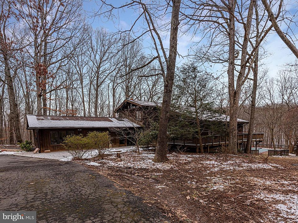 A Wonderful unique home on 5 wooded acres. No HOA. Very large 3 car detached garage. Home has been updated in Kitchen with granite and SS Appliances. Vaulted Ceilings with Beams. Family Room with beautiful Stone Wood burning fireplace. Master on Main Level with walk in closet. Sun Room with Large Hot Tub & Ceramic Floors. 1 Bedroom Apartment on Main Level with Family Room, Eat in Kitchen & full bath. 4 Bedrooms on upper level with vaulted ceilings. Lower Level is a walk out with 1 Bedroom, Workshop, Rec Room with fireplace that has a wood stove insert (Woodstove insert sold AS IS) and Pool Supply Room. Large Inground Pool. Seller says that it works but is being sold "AS IS"