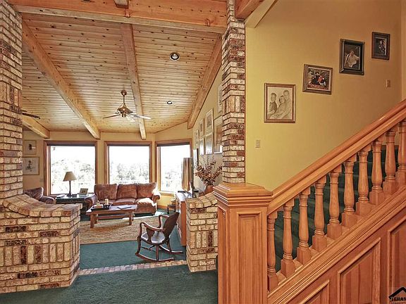 Beautiful home on the hill with breathtaking views for miles. Everything you may want from the open kitchen w/an island, large dining area, brick hearth, wood ceilings and beams to a main bedroom that has a walk in closet, tile shower and a soaking tub. Large laundry room, finished garage, second garage/shop/work out area has a bathroom, an office area and a look out tower with decking. Home has 2 other decks and a patio to entertain on. Landscaping is lovely and low maintenance. Solar is owned and helps make your power bills lower. All located on 14.85 oak treed acres.