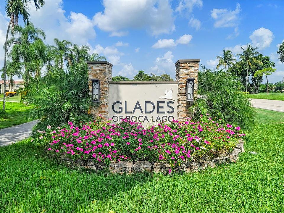 LOOK NO FURTHER! This exquisitely appointed, fully renovated first floor corner unit located in the 55+ resort-like community of Glades of Boca Lago has it all! Experience the serene and peaceful view of the golf course through the glass-enclosed Florida room. Beautifully updated open concept kitchen w/wood cabinets, granite, SS appliances, spacious breakfast counter, smooth ceilings, remote controlled blinds, updated lighting fixtures, washer/dryer in unit, expansive 24x24 porcelain tile, oversized primary bedroom w/ample closet space, new bathrooms w/floating vanities, walk-out patio on the side, separate outside exterior storage, roof 2021, community pool and clubhouse. Optional CC membership w/golf, tennis & much more. Furniture negotiable. A MUST SEE!!!