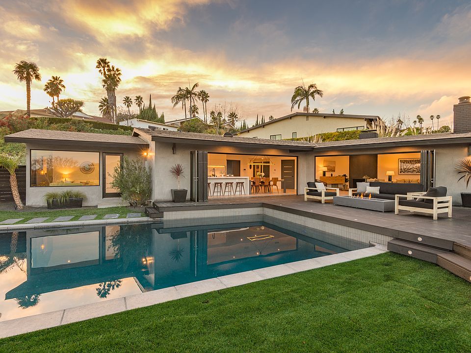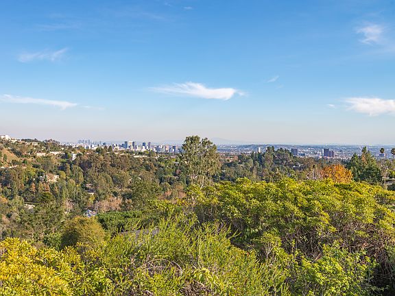 Emotive Mid-Century Modern Brentwood Home on a very private off-street lot with dramatic views of The Getty, Brentwood Country Estates, Century City and Downtown LA. This remodeled 4 bedroom, 3.5 bath home with private office features over 50 linear feet of folding doors that enable all of the main living areas to open seamlessly to the serene pool deck and flat lawn. The kitchen has a built-in fridge, 48" range, wine chiller, bookmatched marble and a bespoke dining table that conforms to the geometric lines of the home. The master suite features a second fireplace, freestanding tub, dual vanities and a large walk-in closet. The private office functions as a perfect space for a home business with private access. Experience the unique combination of sophisticated design, a truly private and quiet off-street resort-style setting with exceptional views.