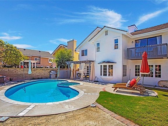 Just a few blocks away from Lake Mission Viejo, this timeless Mission Viejo pool home, located on a quiet cul- de- sac street. Entertainers backayrd boasts 2 fire pits, re-surfaced pool with heater and spa, drought tolerant landscaping and lots of space. Views of the Saddleback mountains from the private deck in the primary bedroom as well as city views from the deck located off of the bomus room. Eye-catching architectural details that add vibrant character and charm to this home are everywhere. Well-manicured landscaping gives awesome curb appeal to the spacious front yard which will lead you to the distinguished double doors inviting you into the living room. The living room features vaulted ceilings which help to usher in soft natural light. The formal dining room, located adjacent to the living room, overlooks the picturesque backyard. The kitchen boasts plenty of cabinet space as well as granite countertops, stone backsplash and an eat-in dining area. A generously sized pantry located off of the kitchen is perfect for organizing and storing your gourmet delights. The family room features a inviting fireplace with built in custom cabinetry, perfect for family pictures and special keepsakes. The downstairs bedroom with full bathroom is ideal for a mother-in-law, teenager, or honored guests. Upstairs offers rooms for all activities, including the primary bedroom with cozy fireplace, two closets and a private patio area that affords a view of the mountains while overlooking the sparkling pool and spa. Generously sized secondary bedrooms are located near the remodeled secondary bathroom. Laundry room is conveniently located upstairs. A private Home Office is connected to the newly remodeled deck and receives the gentle ocean air with easy natural light. Other great features include, new garage doors, recessed lighting throughout, new carpet, new exterior paint. Exclusive amenities include access to Lake Mission Viejo which has many activities that include boating, swimming, 4th of July fireworks shows and summer concerts with Grammy winning musical artist’s. Low HOA and No Mello-Roos. Welcome home.