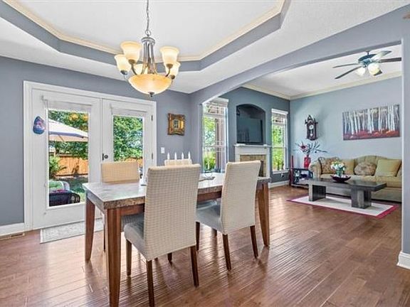 This beautiful ranch reverse is move-in ready! Have a parent or family member who needs to live in the same home? Love to entertain? Don't want any pesky neighbors behind you? This the is the house for you! Easy highway access to I-35 and US-169. Multiple shopping areas nearby! This home features a main level master, second bedroom and third bedroom office. Hallway laundry closet, hall full bathroom, spacious living room, large breakfast dining room, kitchen with walk-in pantry, fireplace. Outside features new landscaping, a small water feature, concrete patio outback, plenty of trees and a huge berm - but no neighbors out back! The lower level would be a perfect apartment for family or great for entertaining; it features a huge bedroom with it's own attached bathroom, a full size bar kitchenette, large rec room with built-ins, bonus room that was once a dressing room (dressing room picture is from previous owner), and 3 large egress windows to let in natural light. Fresh paint on the main and lower levels, as well as the front exterior. Gorgeous granite counter tops in ALL bathrooms, kitchen, and basement bar. Resort type community pool! Seller's do not like using chemicals outside so the grass could use some love, but the home is very well maintained and super cozy.