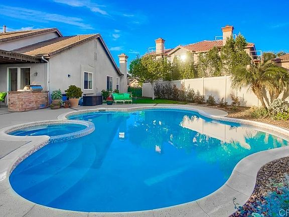 Privately located in the gated community of Peppertree Park, this exquisite one-story, 4-bedroom, 2.5-bathroom home rests on a premium .48-acre lot, offering a haven of tranquility at the end of a quiet cul-de-sac. Beyond the custom front door, a lush yard awaits, complete with a sparkling saltwater pool surrounded by fruit-bearing trees—a perfect retreat for relaxation and outdoor gatherings. As you step inside, you're greeted by a beautiful round foyer adorned with a sparkling chandelier, setting the tone for the elegance that awaits. With 12-foot ceilings and wide hallways, every corner exudes a sense of grandeur and spaciousness. Entertain guests in style in the formal dining room, complete with a butler's pantry connecting seamlessly to the large eat-in kitchen and family room. Escape to the backyard through one of the three glass doors and relax under the awning or enjoy the built-in BBQ with mini fridge that faces the heated salt water pool and spa plus grassy area and serene west facing view with extra privacy created from the hillside and no direct rear neighbors. Indulge in the ultimate comfort with modern amenities such as a cozy fireplace, newer appliances including a stove and oven. Embrace sustainable living with paid solar panels and a whole house fan that effortlessly circulates fresh air, reducing utility costs while preserving the environment. Every moment in this exceptional home is a testament to the finer things in life. Experience the epitome of luxury living at Peppertree Park, where every day feels like a vacation in your own slice of paradise. Welcome home.