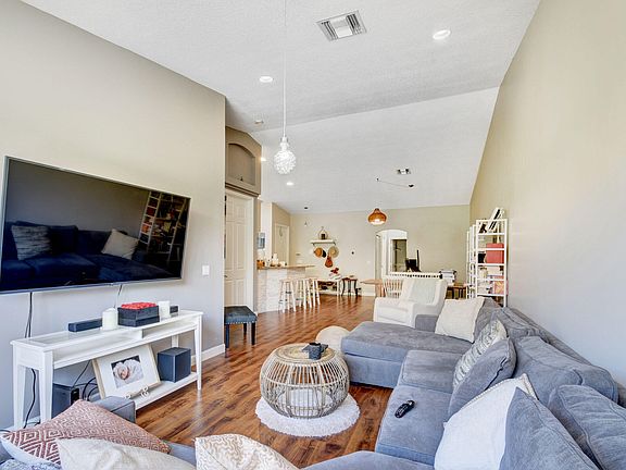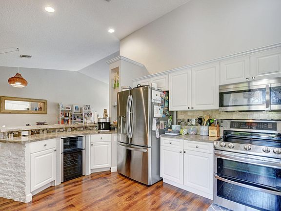 Beautiful 2/2 CBS Townhouse with a split bedroom and open concept floor plan, vaulted ceilings, and a 2-car garage located in Andros Isle. No expense spared in custom built kitchen with stone facade bar seating, LG stainless steel appliances, custom shelving enclave, double door oven, and wine cooler. Step outside into a courtyard-styled area just outside your front door with an added benefit of being in front of a wide-open grassed area just outside your house. Additional features include upgraded dark flooring, custom master built in closet, upgraded shower enclosure in guest bath, cabinets in laundry room, high hat lighting, tv mount installed for 90 in. TV, and wide baseboards. Smart home features include Nest thermostat, keyless entry, and myQ smart garage door opener. The water heater, kitchen appliances, and wine cooler are recently installed.