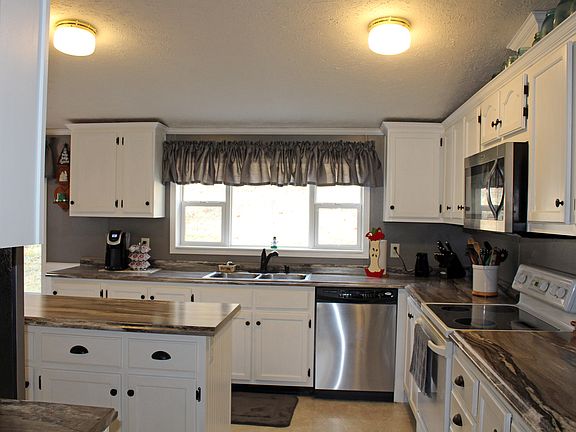 Get away from the city life in this private hunter's paradise! Enjoy the view from the spacious front porch, cozy up to the fireplace on chilly evenings and grow your own vegetables in the perfect garden spot. The home's many windows provide ample natural light. The large, bright kitchen features an island, tons of cabinet space, and stainless steel appliances. The master bath has double sinks, ample storage including a walk in closet, a soaking tub and separate shower. The large barn/outbuilding has power and would make a great workshop. There is also a 30 ft. shelter with power for RV/camper storage. 4.5+/- open acres, the rest of the acreage is wooded. Survey available.