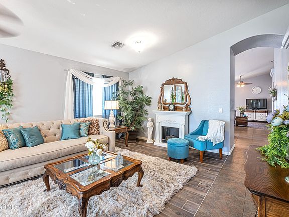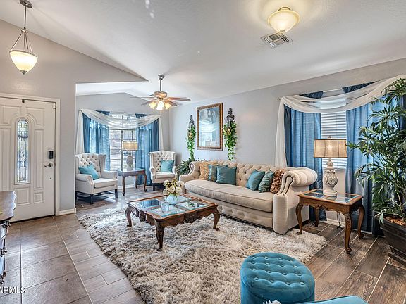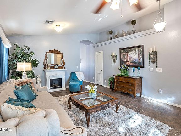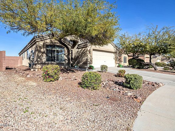 This charming, comfortable home can be yours for under 400k. Upgrades throughout - plank tile flooring in living room and family room, vaulted ceilings. The kitchen has beautifully upgraded wood-stained cabinets that are staggered, granite counters with a decorative backsplash, stainless steel appliances and a large island. Separate living room and great room. Hallway has a built-in desk area. Sit outside in your backyard and enjoy great mountain views. Pavers and easy to care for artificial grass. Storage shed. Leased solar allows for low energy bills. Buckeye is considered one of the fastest growing cities in the country! Close to I-10, new Costco now open. Coming in 2024: Verrado Marketplace and an Abrazo medical campus. Lots of fun things happening. Don't miss this one!
