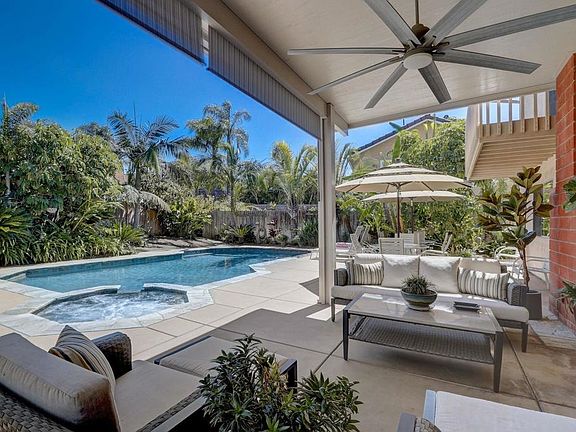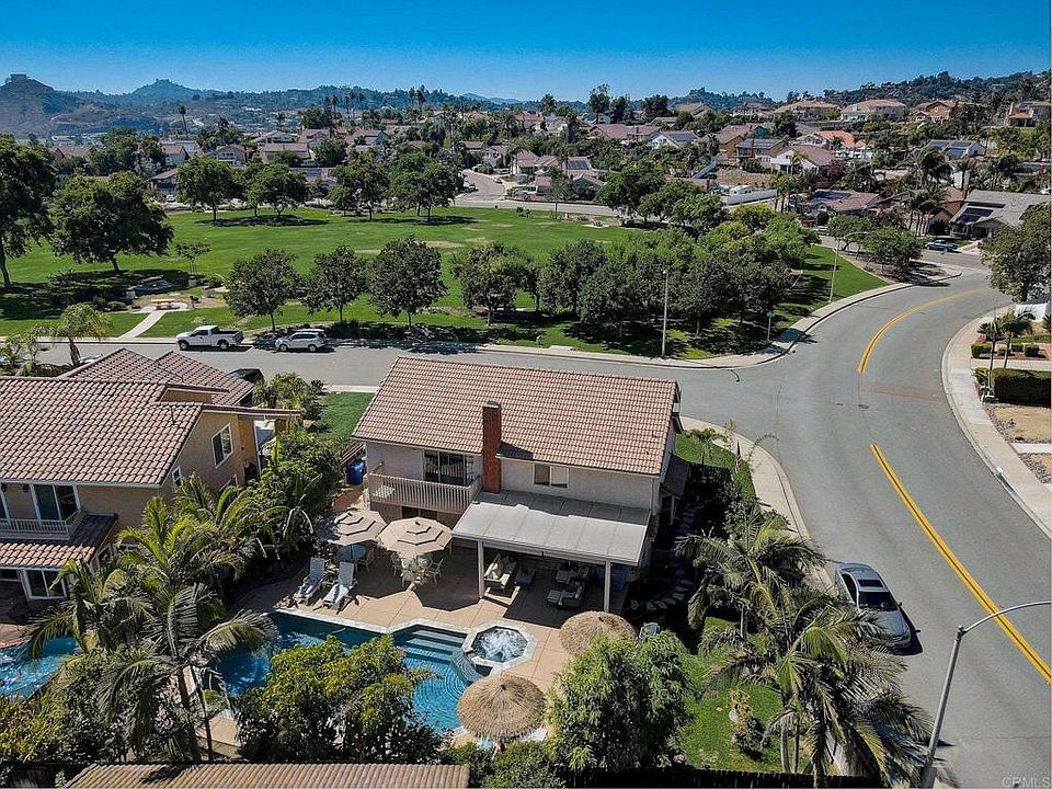 Stunning 4-bedroom dream home in desirable Rancho San Diego neighborhood with heated saltwater pool and spa! Bright and spacious floorplan has tall vaulted ceilings and large windows. Kitchen has stainless steel appliances, 13 pull out shelves for storage, barstool area open to family room and views with slider access to pool. Convenient downstairs bedroom and full bathroom is great for an in-law suite. Entertainer's delight backyard has built-in synthetic palapa umbrellas, lighted palms, BBQ area, and features plumbed gas fire-pit for cozy evenings under the stars. Enjoy playing pool volleyball with deck sockets and 3.5 feet depth at both ends of the pool and 5 feet depth in the middle. Relax in the shaded patio area under the Aluma cover with ceiling fan. Lush landscape with low voltage lighting includes an array of fruit trees: meyer lemon, holiday avocado, lime, loquat trees, as well as banana plants. Primary bedroom retreat has vaulted ceilings, large bonus loft storage, slider access to balcony overlooking yard and mountain views, two closets, built-in ironing board, and an en-suite bathroom. Large 7,423 square foot corner lot is right across from serene neighborhood Woodhaven County Park. Attached 3-car garage and driveway provide ample parking. Amazing location is close to schools and shopping. This one is a must see!!